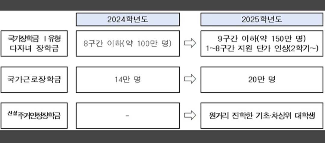 한편 교육부는 2025년 대학생 가구의 학자금 마련 부담을 완화하기 위해 국가장학금 지원 대상을 8구간 이하에서 9구간 이하로 늘리고, 근로장학금 지원 인원을 14만 명에서 20만 명으로 확대했다.