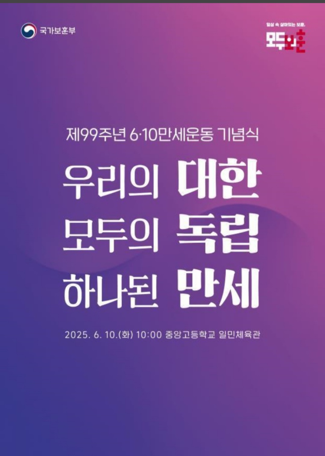 국가보훈부는 일제강점기 6·10만세운동 선열들의 숭고한 독립 의지와 애국정신을 계승하기 위해 '제99주년 6·10만세운동 기념식'을 10일 서울 중앙고등학교 체육관에서 거행한다고 밝혔다.