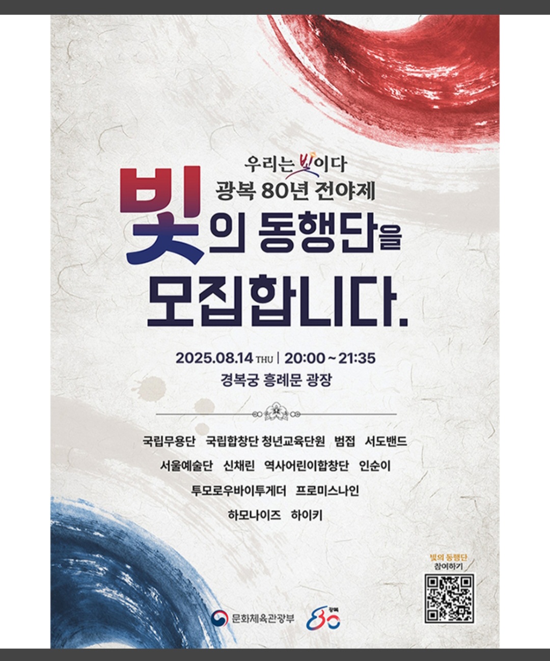 이번 전야제 행사는 누구나 참여할 수 있다. 참석을 희망하는 '빛의 동행단'은 오는 7일까지 문체부(https://www.mcst.go.kr) 또는 광복 80년 기념사업추진위원회(https://www.korea815.go.kr) 누리집에서 동반 1인까지 신청할 수 있다.