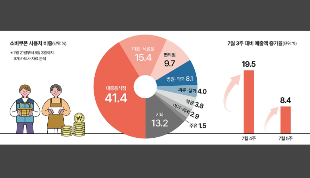 행정안전부가 8월 7일 발표한 자료에 따르면 소비쿠폰 지급 이후 특히 생활 밀착 업종의 매출액이 증가한 것으로 나타났다. 8월 3일 기준 국내 신용·체크카드로 지급된 소비쿠폰은 총 지급액 5조 7679억 원 가운데 46%인 2조 6518억 원이 사용됐다. 행안부가 7월 21일부터 8월 3일까지 9개 카드사(KB국민·우리·NH농협·롯데·비씨·삼성·신한·하나·현대)의 소비자 사용액을 제공받아 분석한 결과다.