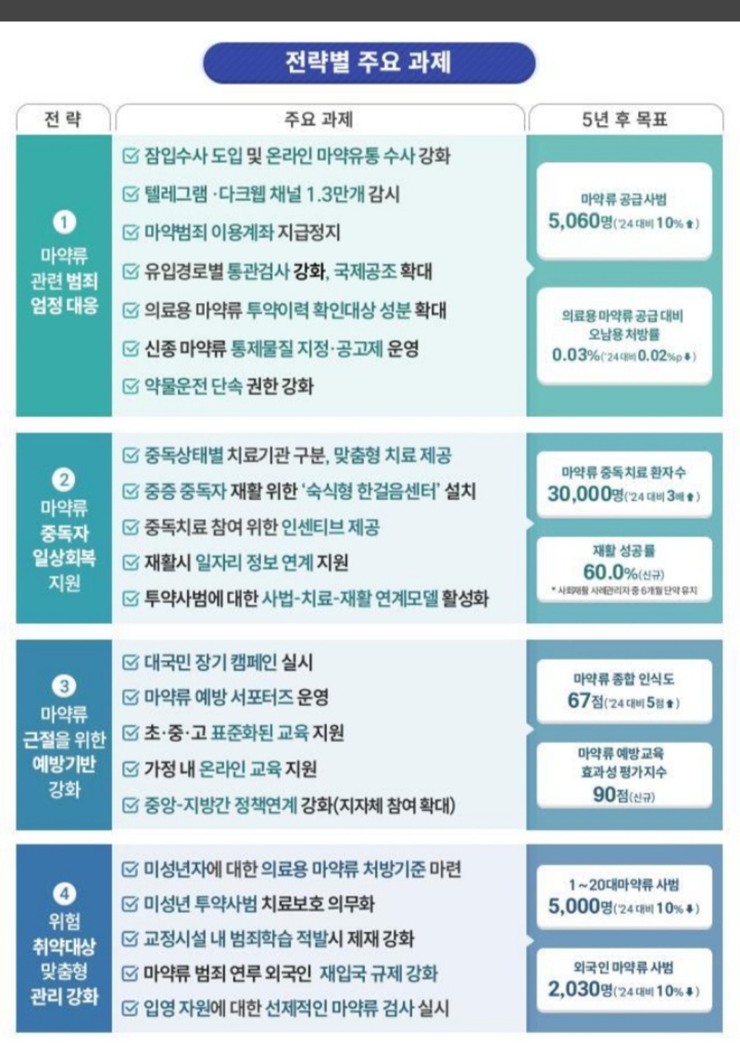 국내 유통은 경찰 온라인마약수사전담팀이 온라인 마약사범 1663명을 검거하고, 의료용 마약류는 식약처 시스템 활용 오남용 의심기관 68곳을 점검해 23곳을 적발했다.