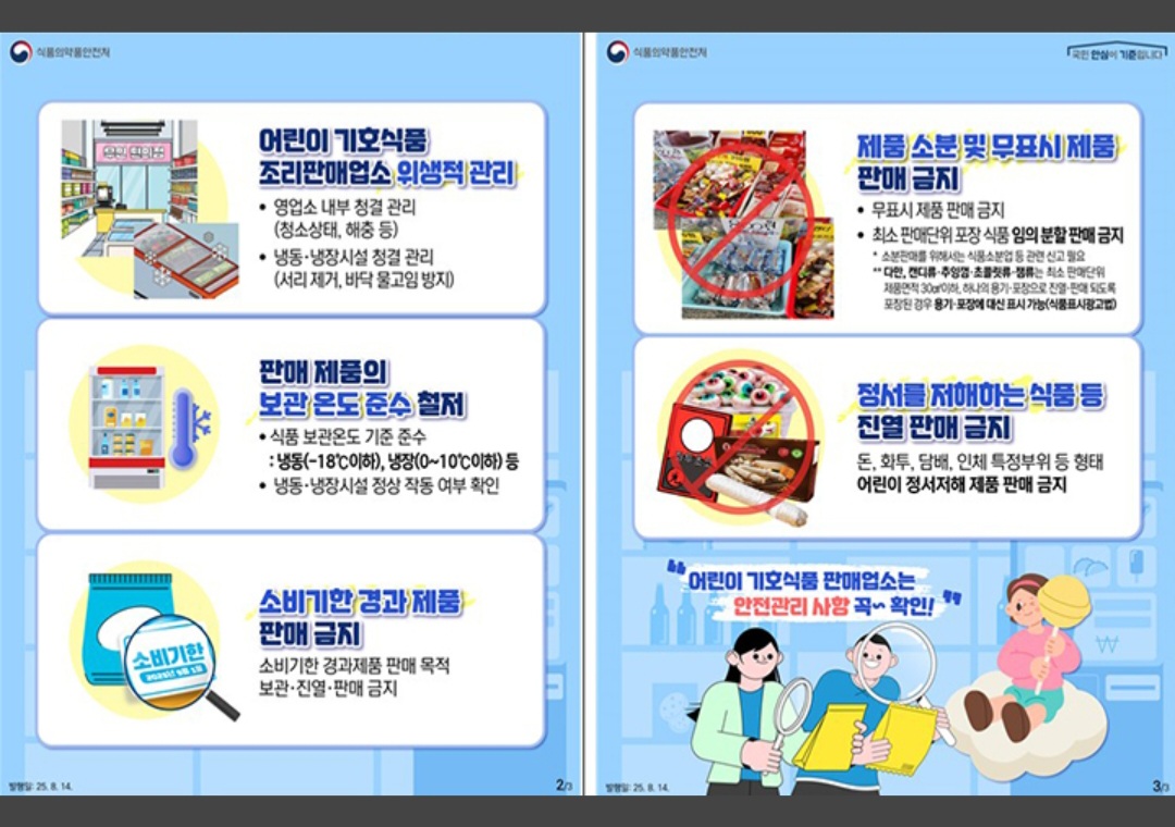 이는 어린이·청소년에게 안전한 먹거리를 제공하기 위한 것으로, 급식·조리시설 위생관리 및 소비기한 경과 제품 사용보관 등을 집중 점검할 방침이다.