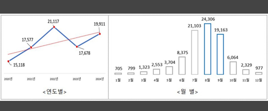 이는 8월 중순 이후가 벌들의 활동이 가장 왕성한 시기인 바, 특히 2022년에는 2만 명이 넘는 벌 쏘임 환자가 발생했고 2023년을 제외하면 벌 쏘임 환자 수는 해마다 증가하는 추세다.