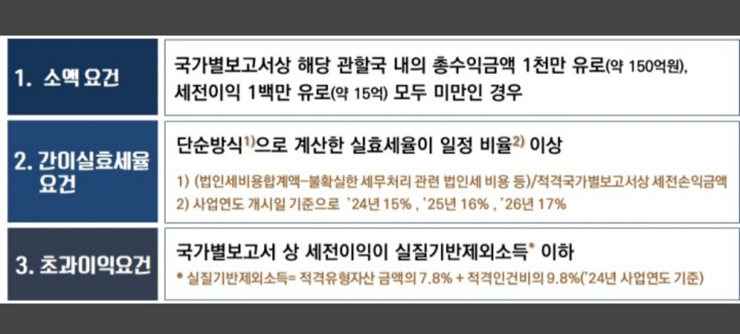 A5. 전환기 적용면제란 일정 요건을 충족하는 경우 복잡한 글로벌최저한세의 계산 없이 추가세액을 0으로 인정하는 제도입니다. 단, 글로벌최저한세 도입 후 3년간 시행되는 제도이며 적용면제 요건은 다음과 같습니다.