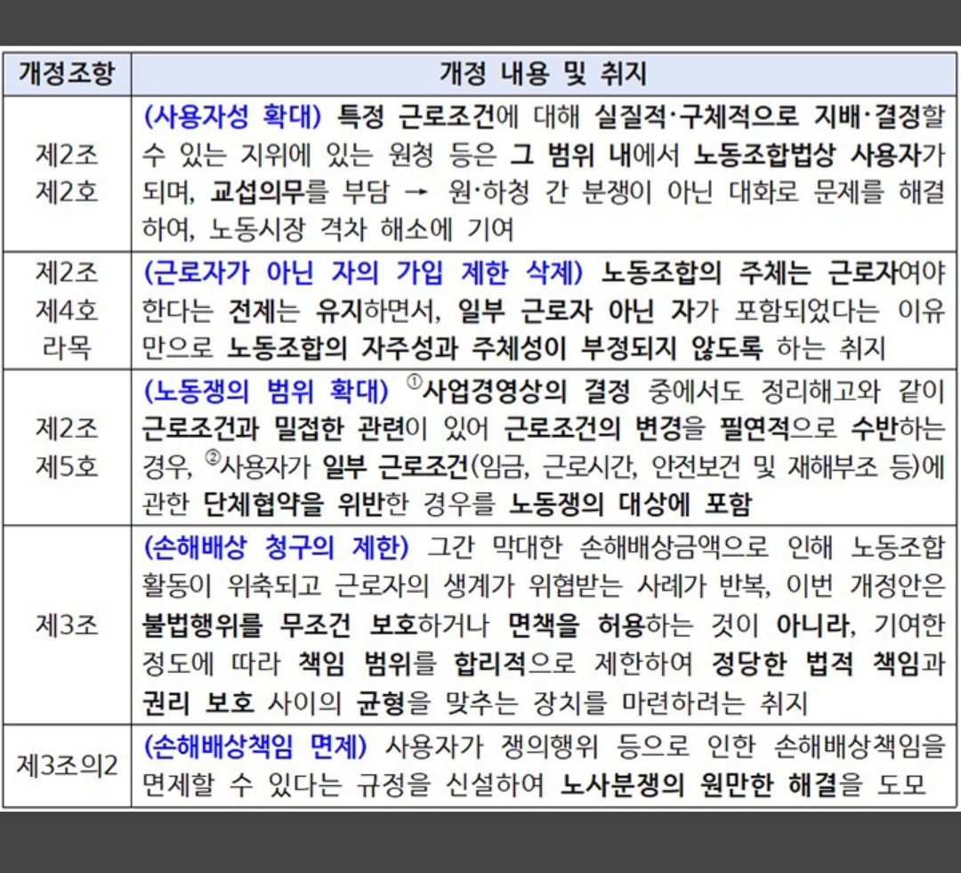 한편 이번 노동조합법 개정은 변화한 노동환경과 산업구조에 대응해 권한과 책임이 불일치하는 제도적 사각지대를 해소하기 위함이다.