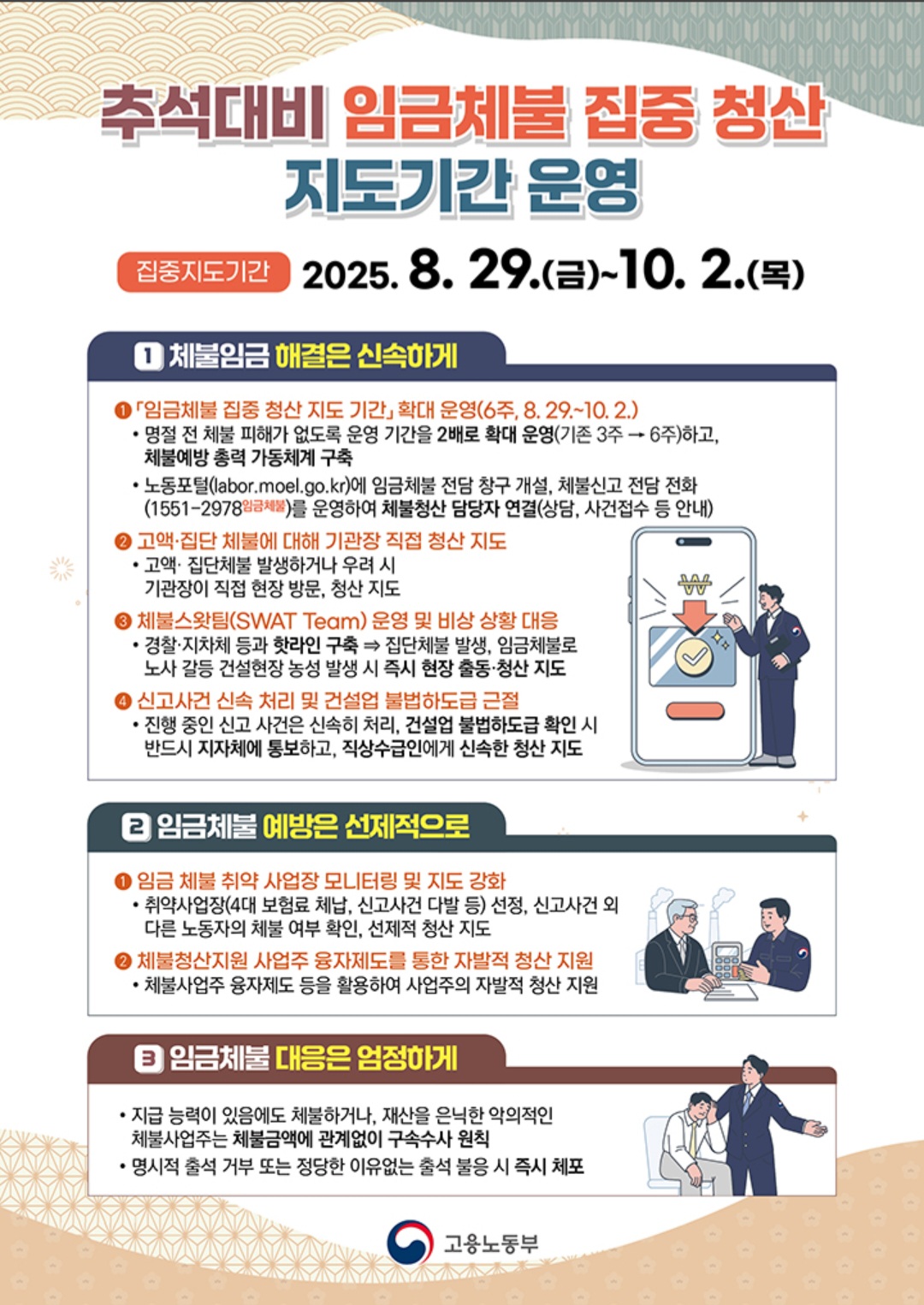 고용노동부는 "최소한 명절 전 만이라도 일을 하고도 임금을 받지 못해 힘든 시간을 보내는 분들이 없어야 한다"는 각오로 이번 계획을 마련했다.
