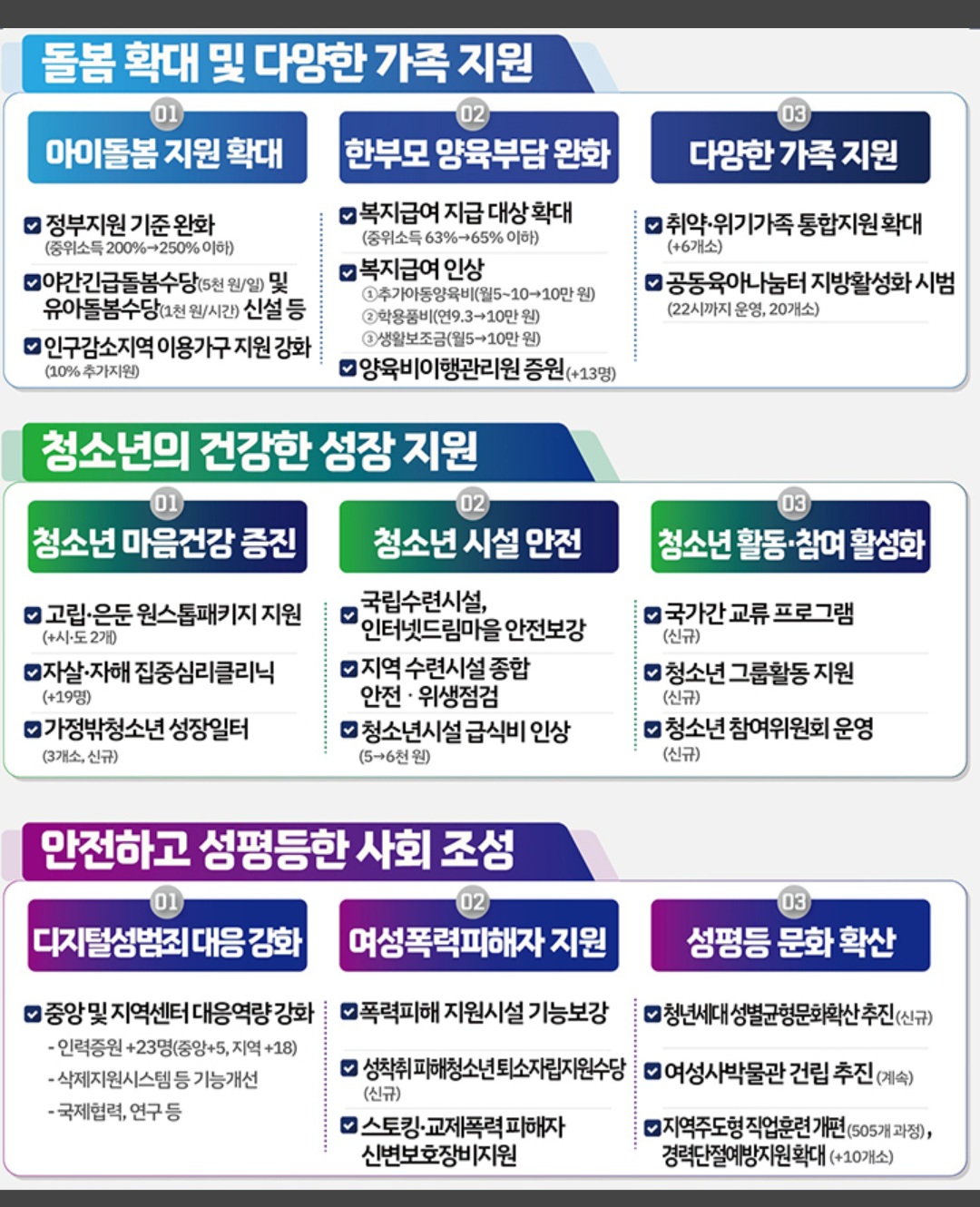 이에 다양한 가족 지원 및 아이돌봄 지원 확대, 청소년의 건강한 성장 지원, 안전하고 성평등한 사회 조성 등 주요 핵심과제를 중점 추진할 계획이다.