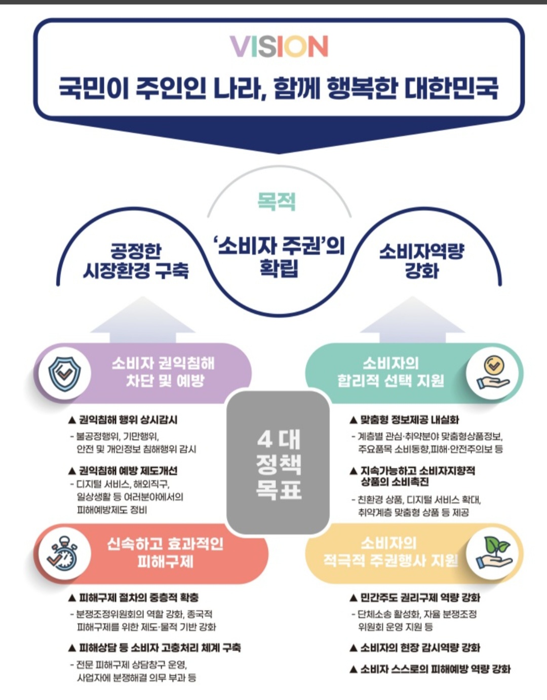 관계부처는 ▲소비자 권익침해 차단 및 예방 ▲신속하고 효과적인 피해구제 ▲소비자의 합리적 선택지원 ▲소비자의 적극적 주권행사 지원의 4대 정책목표에 따른 세부과제들을 합동으로 추진해나간다.