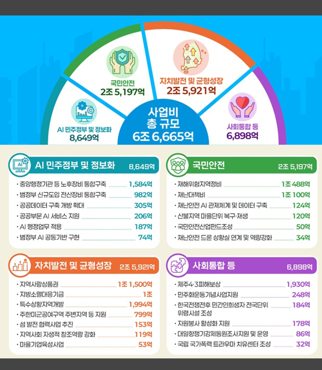 이에 이재명 정부 첫 예산안으로 세계 최고 인공지능 민주정부 구현, 국민 안전 확보, 자치발전 및 균형성장 촉진, 사회통합 및 과거사 해결 등 새정부 핵심과제를 차질 없이 이행할 방침이다.