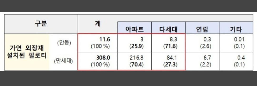 주거용 필로티 건물 28만 동 중 이번 광명 아파트 화재와 같이 불에 잘 타는 가연성 외장재를 설치한 건물은 22만 동(78%)이다.