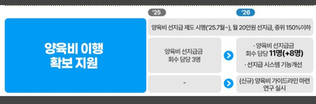 이에 지난 7월 시행한 양육비 선지급금의 회수를 위해 양육비이행관리원의 인력을 징수 인력 8명, 모니터링 인력 3명 등 13명 증원한다.