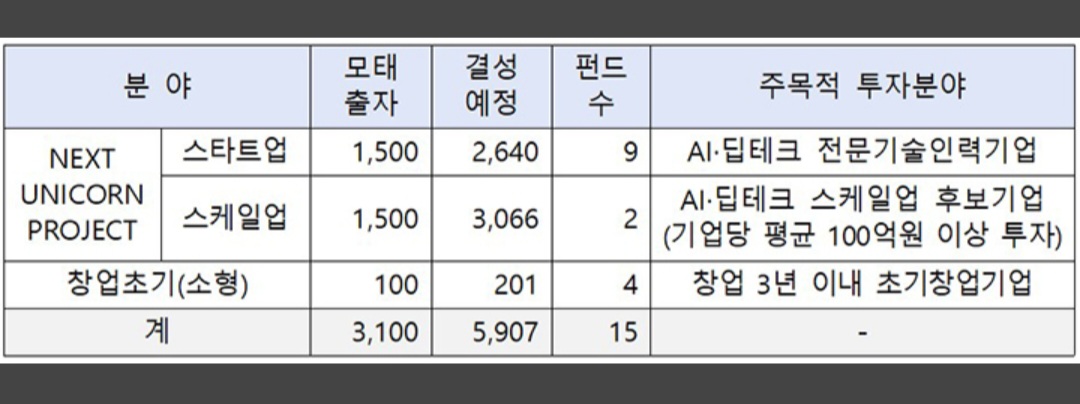 다음으로 AI·딥테크 분야 기업에 평균 100억 원 이상 스케일업 투자를 지원하는 'NEXT UNICORN Project 스케일업 펀드'가 2개 펀드, 3100억 원 규모로 선정했다.