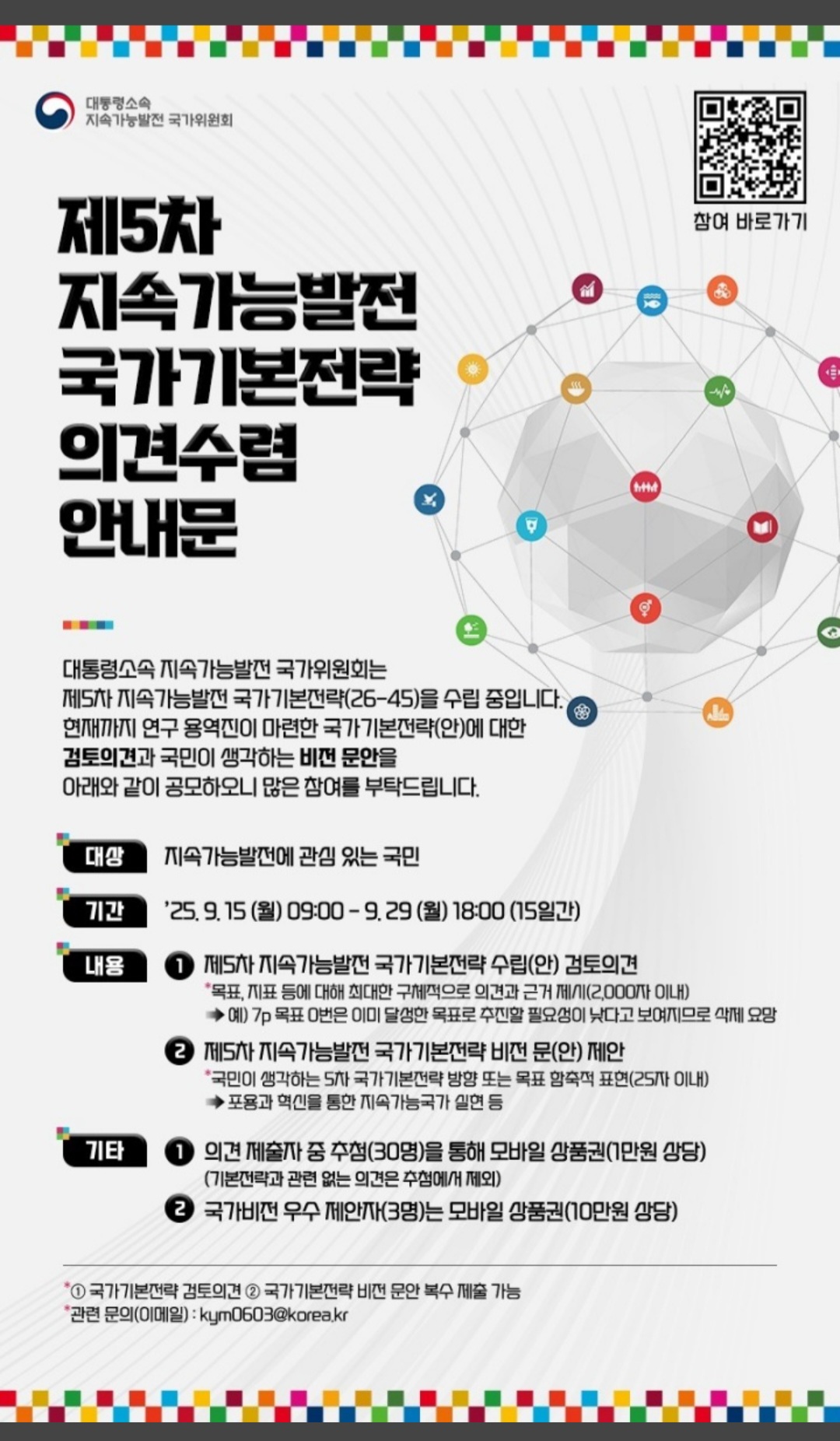 참여방법은 국가지속가능발전 포털(https://ncsd.go.kr)에 접속해 링크 또는 QR코드를 선택하고 제공된 양식에 의견을 작성하면 된다.