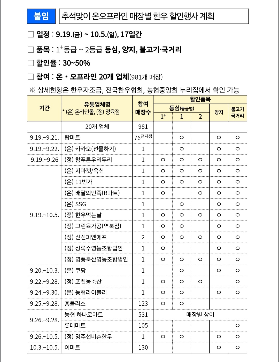 [붙임] 추석맞이 온오프라인 매장별 한우 할인행사 계획