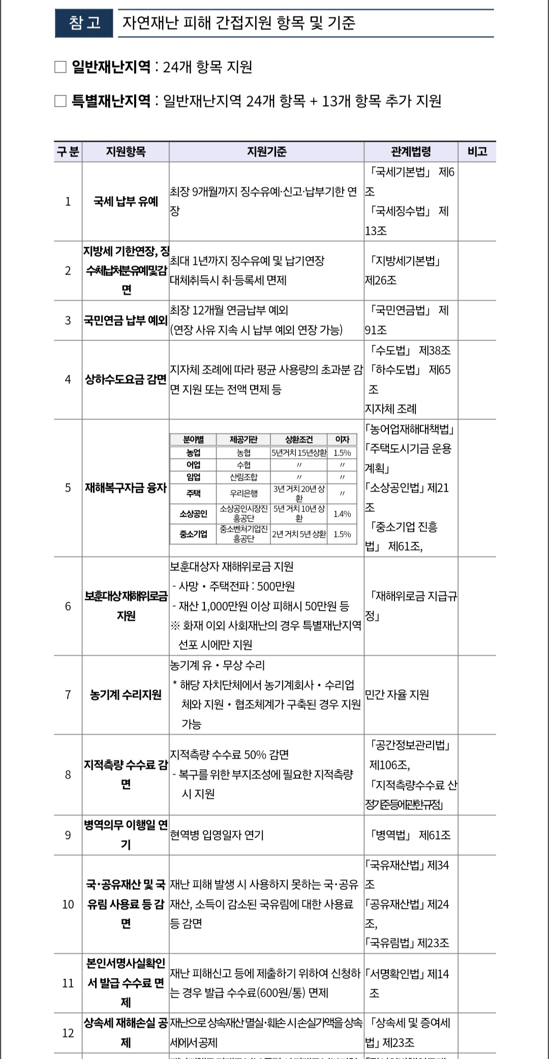 [붙임] 자연재난 피해 간접지원 항목 및 기준