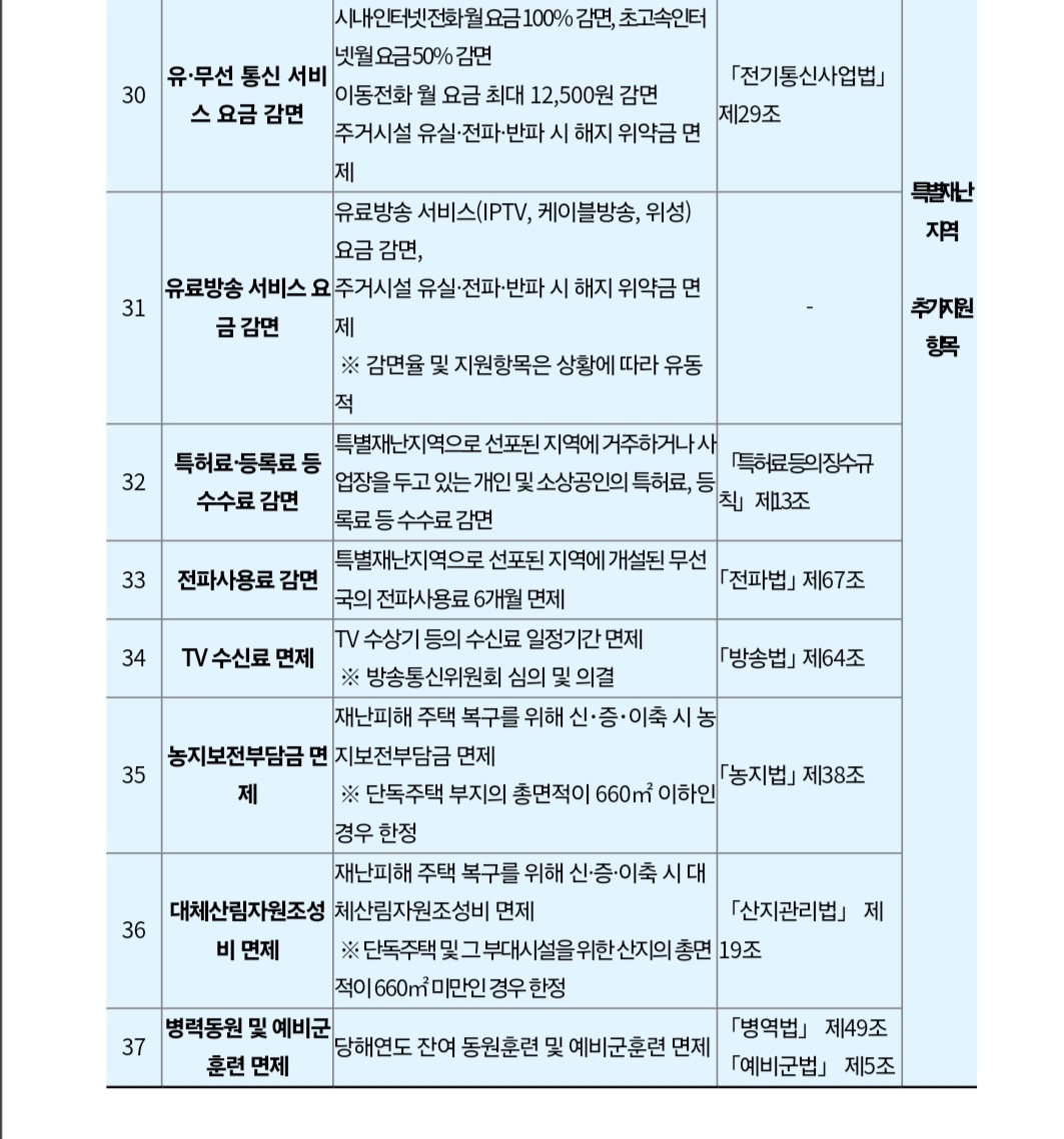 특히 특별재난지역은 일반 재난지역에 제공되는 국세납부 유예 등 24가지 혜택과 함께 건강보험·전기·통신·도시가스요금·지방난방요금 감면 등 13가지 혜택을 추가 제공한다.