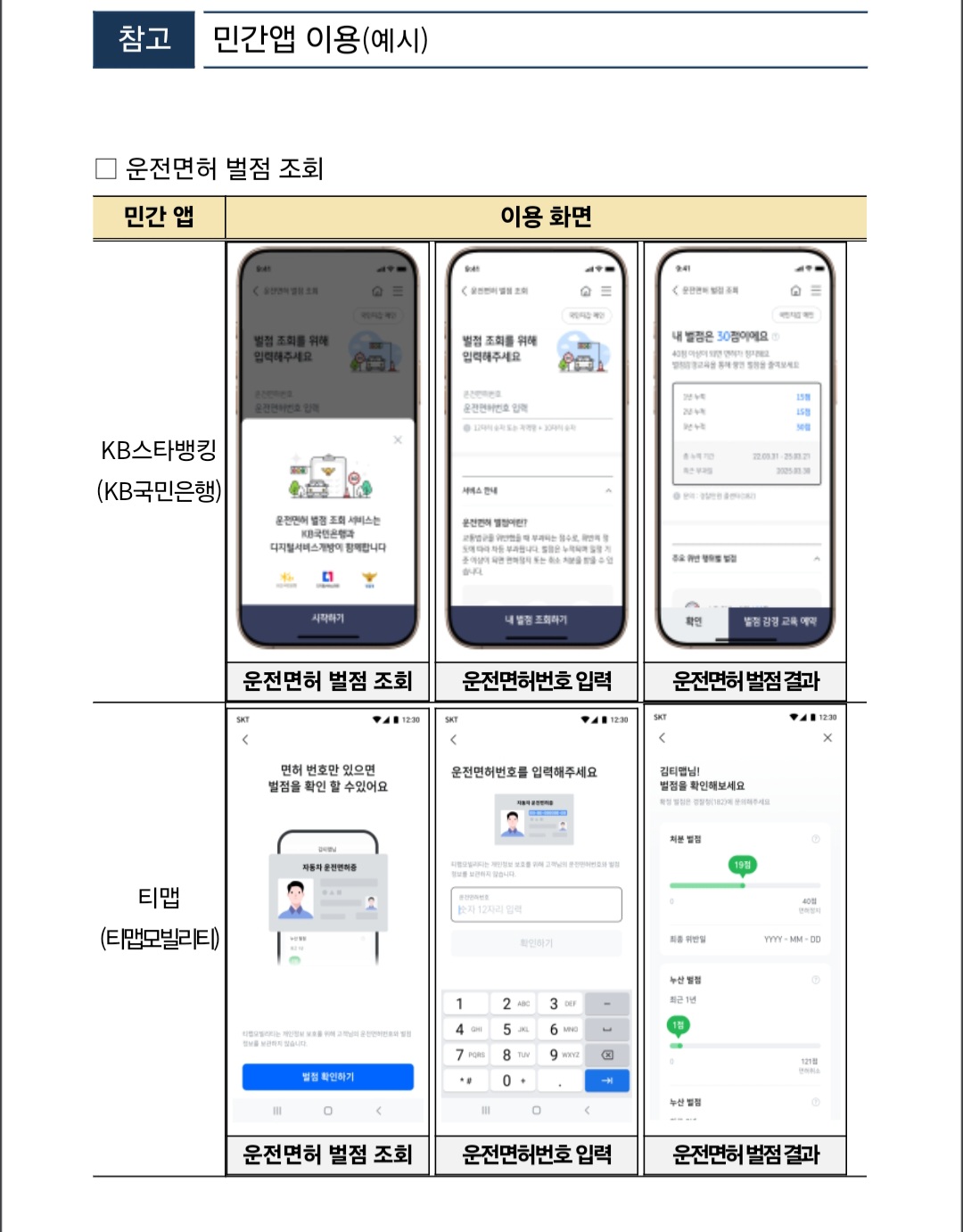 하지만 이번 서비스 개방으로 KB국민은행, 티맵모빌리티 앱에서도 면허 벌점을 쉽게 확인할 수 있게 됐다.