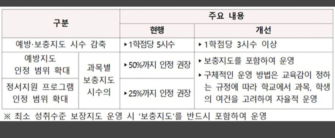 이에 최소 성취수준 보장지도 지침을 유연화하해 보충지도 시수를 줄이고 운영 방식은 학교가 결정하도록 한다.