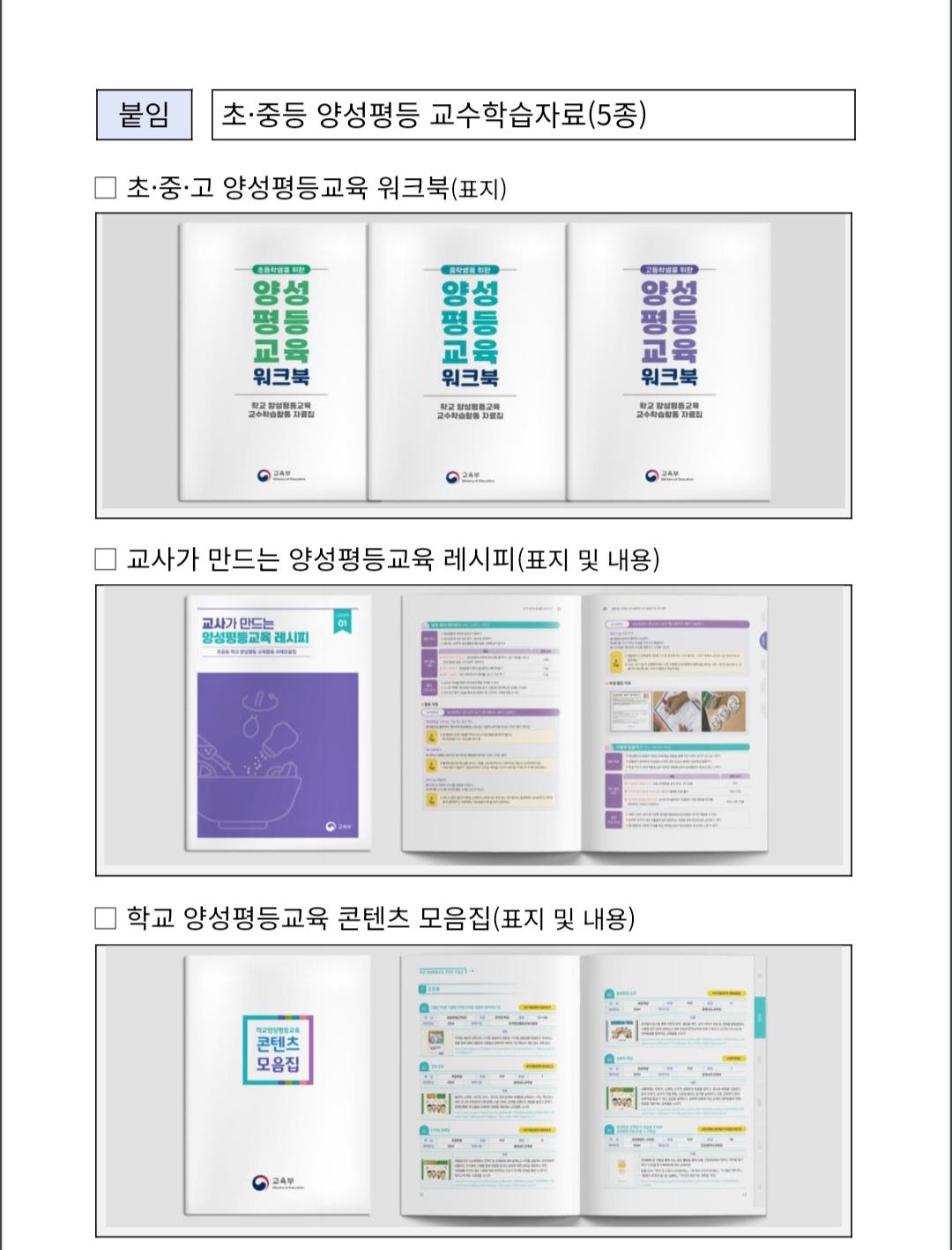 * 「초등학생을 위한 양성평등교육 워크북」, 「중학생을 위한 양성평등교육 워크북」, 「고등학생을 위한 양성평등교육 워크북」, 「교사가 만드는 양성평등교육 레시피」, 「학교양성평등교육 콘텐츠 모음집」