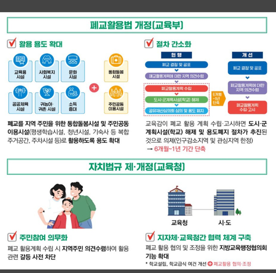 특히 현행 '폐교활용법'에서 정한 교육용 시설 등 6가지 용도 외에 지역 주민을 위한 주민공동이용시설, 통합돌봄시설로도 활용되도록 '폐교활용법'의 용도를 추가한다.