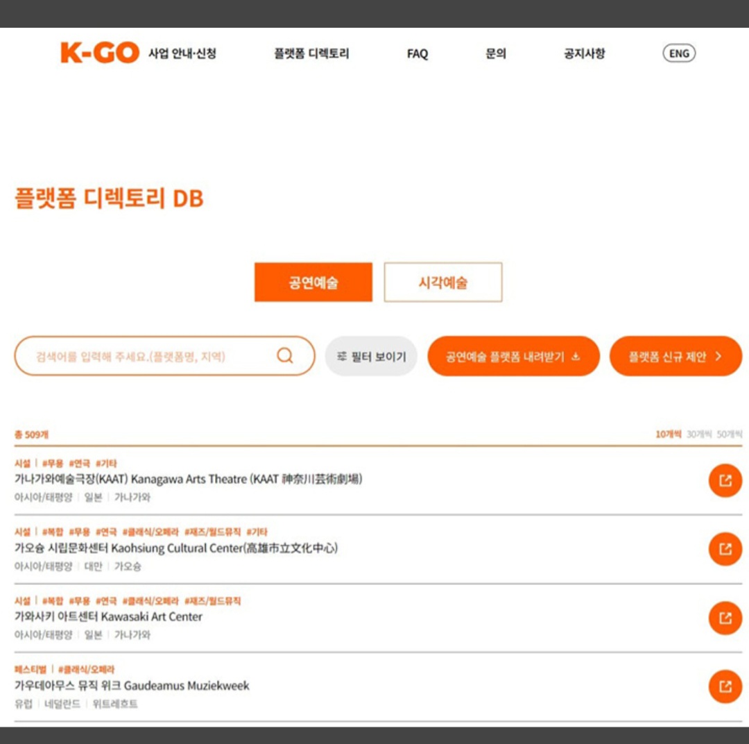 플랫폼 디렉터리는 문화예술인 제안접수와 전문가 조사로 선별된 플랫폼을 수록하고, 지난달 말 현재 모두 71개국 공연예술(509개)과 시각예술(248개) 플랫폼 정보를 제공하고 있다.