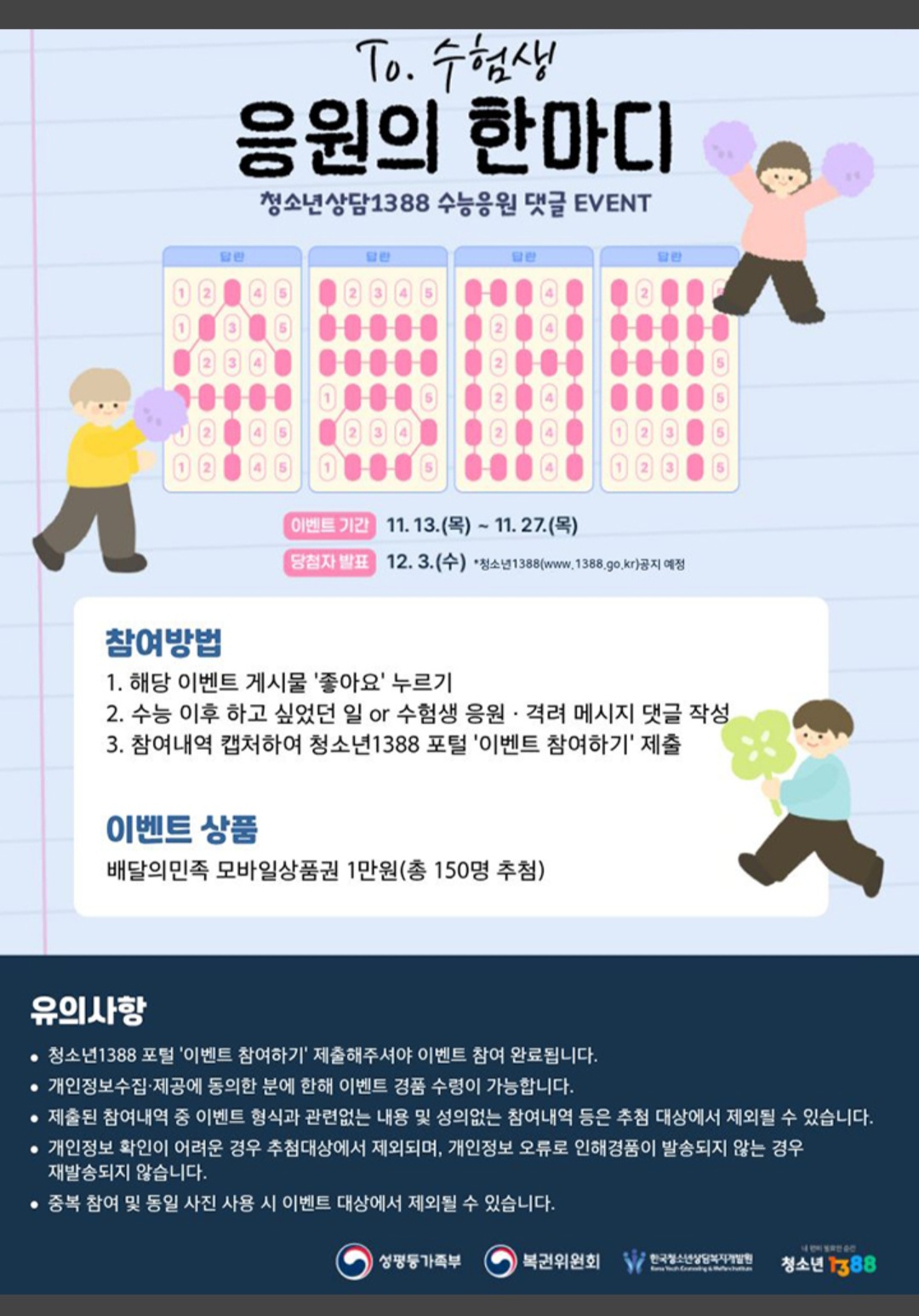 청소년상담1388 또는 청소년상담복지센터 SNS 채널 온라인 이벤트 게시글 '좋아요'를 누르거나 이벤트 게시글에 댓글로 수능 응원/격려 메시지를 작성하면 총 150명을 추첨해 모바일 상품권 1만 원을 증정한다.