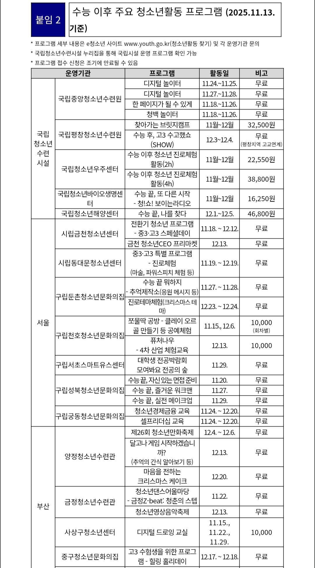 이중 국립중앙청소년수련원은 수능 후 청소년들이 친구들과 긍정적인 추억을 만들 수 있도록 '디지털 놀이터'와 '청백 놀이터' 등을 진행한다.