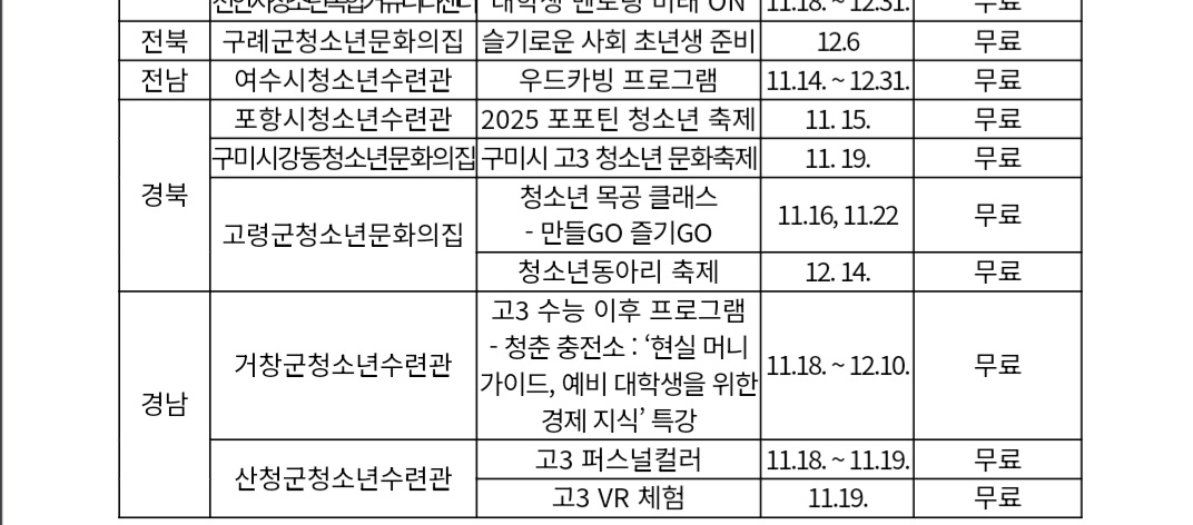 또한 광주시청소년수련관에서는 '스트레스 대처 및 감정조절 능력 향상 프로그램'을, 전북 구례군청소년문화의집에서는 '불법 금융사기 예방 및 아르바이트 노동 인권 프로그램'을 운영한다.