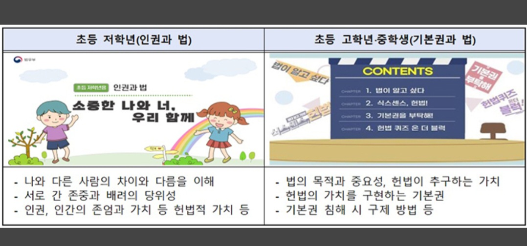 특히 법무부 소속 헌법 전문강사가 교과와 창의적 체험활동 시간을 활용해 학생들이 헌법이 추구하는 가치, 인권과 기본권, 법의 역할 등을 이해하고 체험할 수 있도록 강의하는 바, 내년에는 고등학교까지 확대할 예정이다.