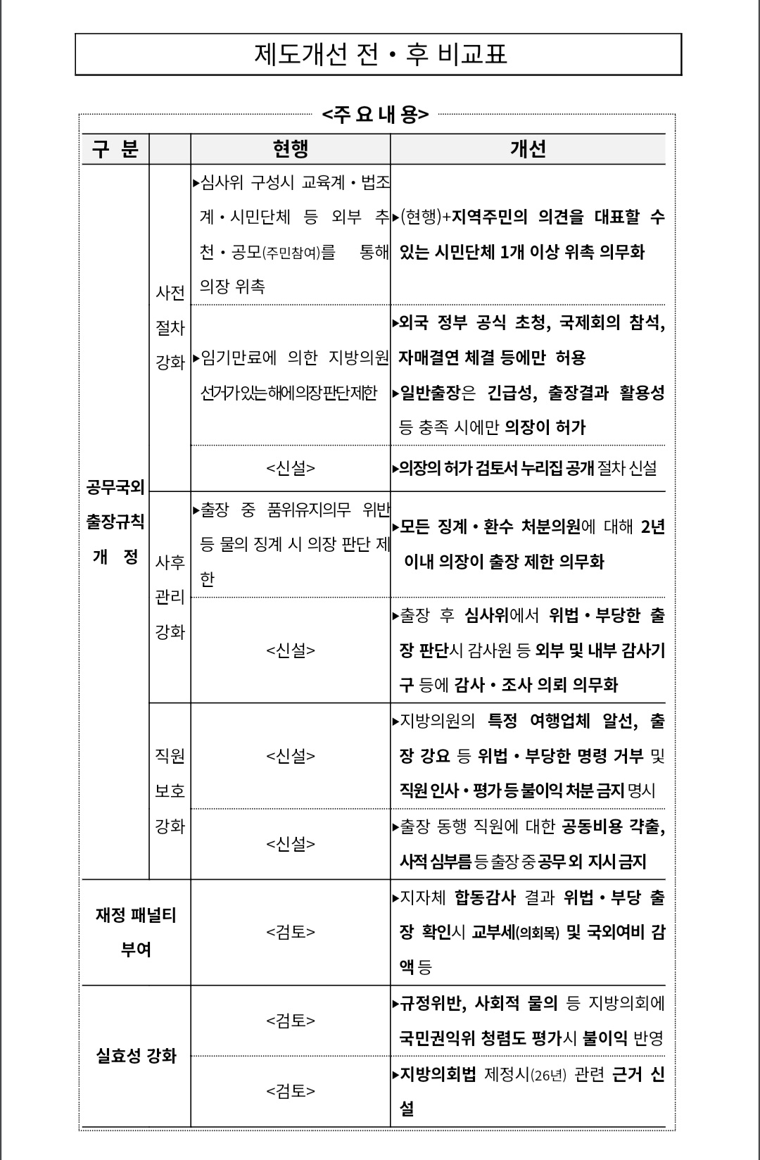 특히 출장 후 사후관리 방안도 더욱 엄격하게 마련한 바, 징계처분 등을 받은 지방의회의원은 일정기간 국외출장을 제한한다.