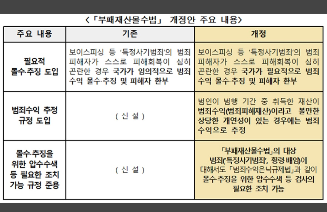 개정안은 피해자가 스스로 회복하기 어려운 경우 범죄수익(범죄피해재산)을 반드시 몰수·추징해 돌려주고, 범행 기간 중 취득한 재산에 '상당한 개연성'이 인정되면 범죄수익으로 추정하며, 몰수·추징 집행을 위해 검사가 압수수색 등 필요한 강제조치를 할 수 있도록 규정했다.
