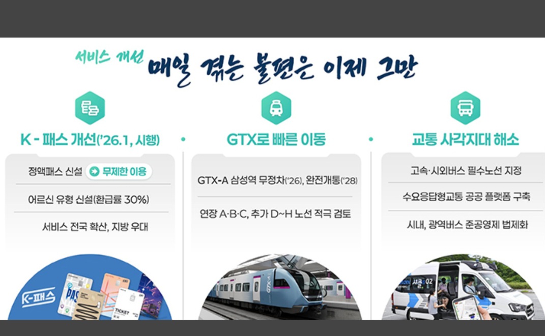 GTX 등도 신속히 확충해 국민들의 출퇴근 불편을 덜어내고, 수요응답형 교통(DRT) 활성화를 위한 공공 플랫폼도 빠르게 구축할 방침이다.