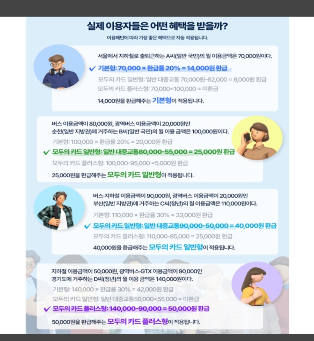 특히 입학, 취업, 방학 및 휴가 등으로 이용자의 생활패턴이 달마다 다른 점을 고려해 사전에 기본형(기존 K-패스 환급방식)이나 모두의 카드 환급 방식 중 하나를 선택하는 것이 아니라, 사후에 K-패스 시스템에서 해당 월의 이용 금액을 합산해 환급 혜택이 가장 큰 방식을 자동 적용한다.