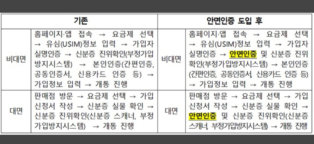 이같은 안면인증은 오는 23일부터는 일부 알뜰폰사(43개)의 비대면 채널 64개 및 이통3사 대면 채널에서 시범적으로 운영하는 바, 내년 3월 23일부터 휴대전화 개통 절차에 정식으로 도입할 예정이다.