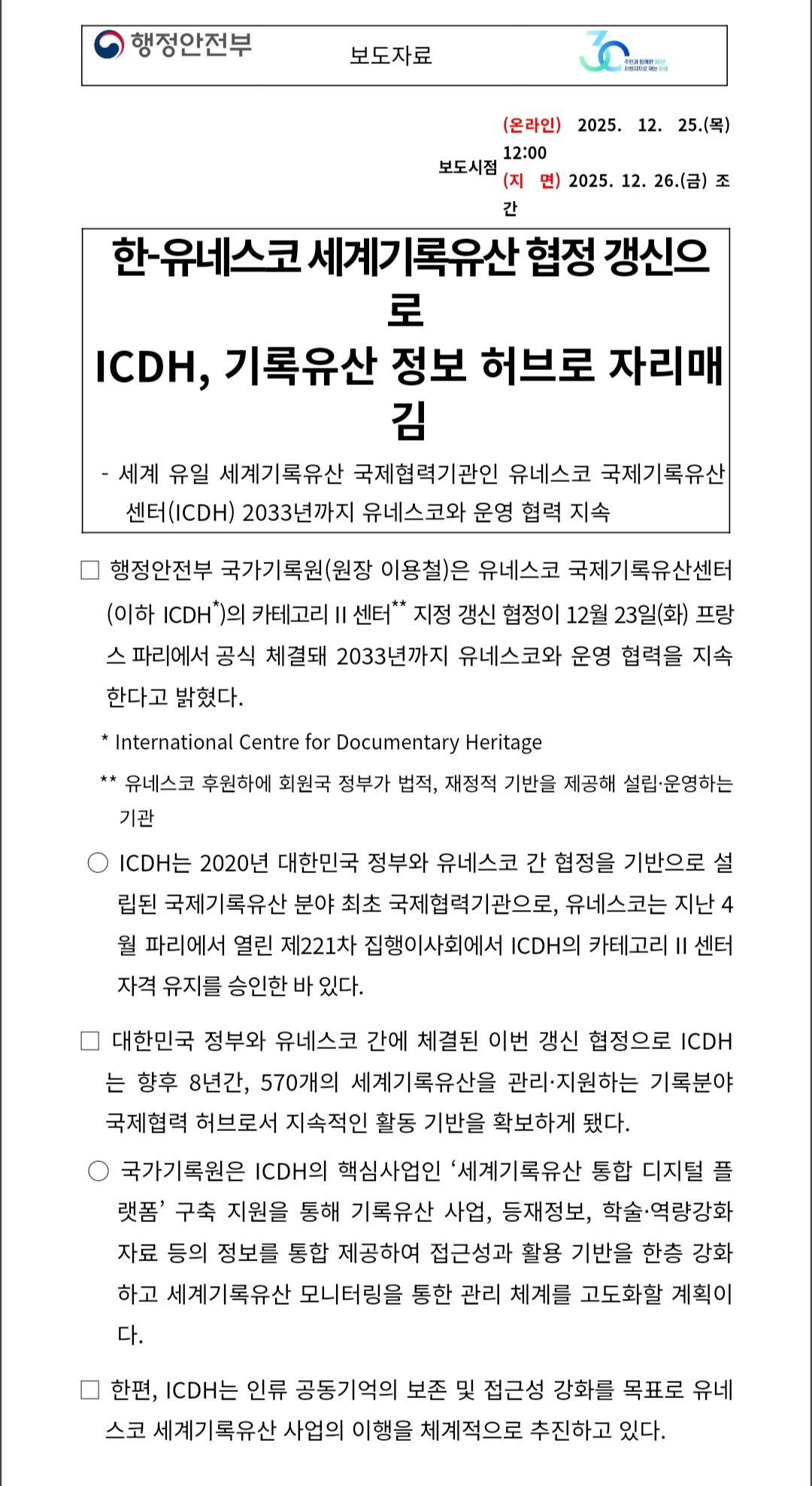 행정안전부 국가기록원(원장 이용철)은 유네스코 국제기록유산센터(이하 ICDH*)의 카테고리Ⅱ센터** 지정 갱신 협정이 12월 23일(화) 프랑스 파리에서 공식 체결돼 2033년까지 유네스코와 운영 협력을 지속한다고 밝혔다.
