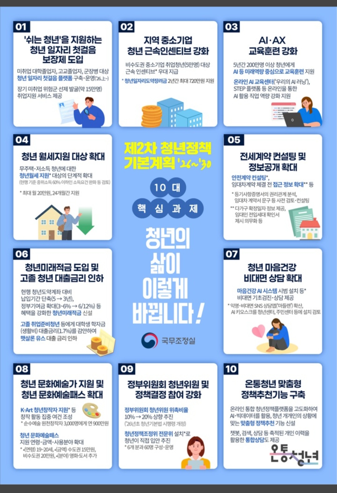정부는 청년이 경제적 어려움이나 사회적 고립 등 위기 상황에서도 삶을 지탱할 수 있도록 금융, 복지, 문화 전반에 걸친 든든한 일상 안전망을 구축한다.