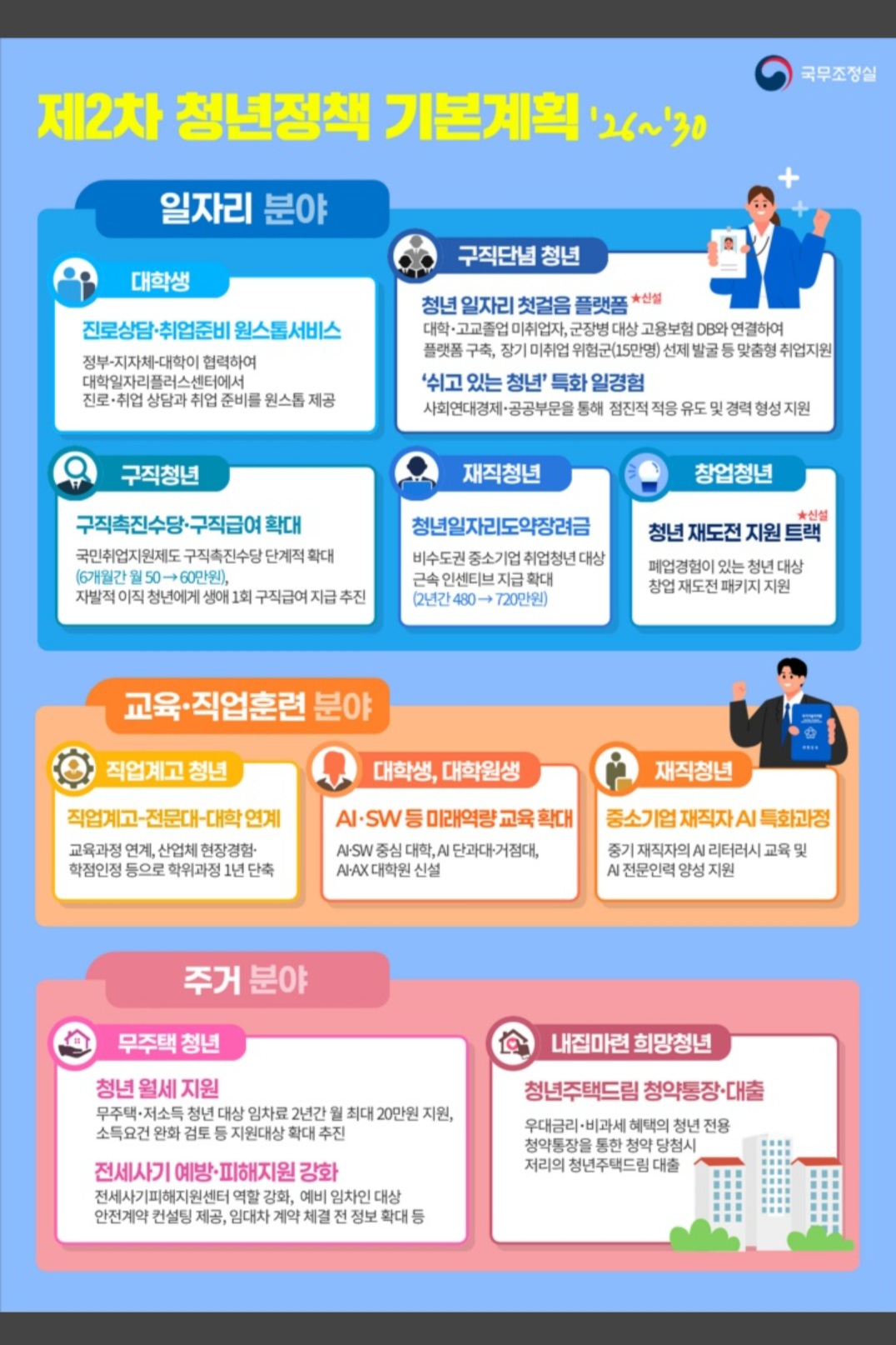 정부는 일자리 기회 확대로 청년의 사회진출을 지원하고, 장기 미취업 상태에 머무르지 않도록 발굴·접근해 서비스를 제공하는 한편, 청년 노동환경 개선 및 권익보호를 강화한다.