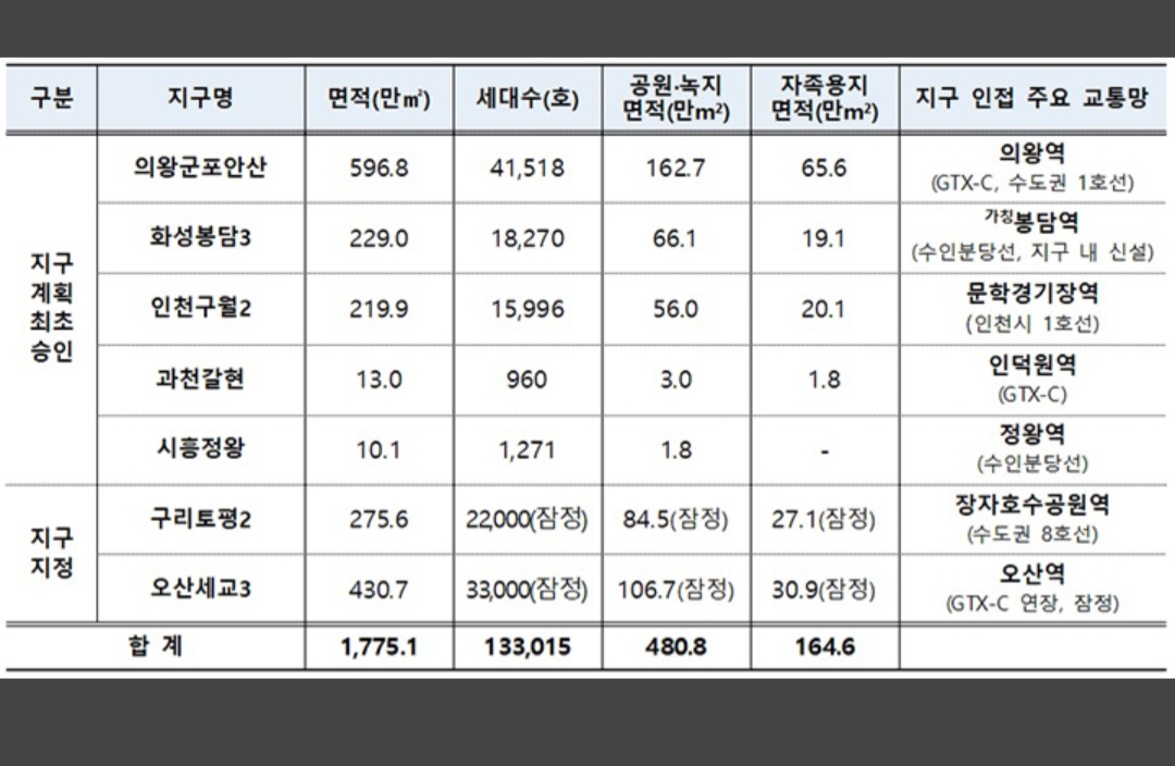 특히 해당 공공주택지구들은 GTX-C·수인분당선 등 주요 노선이 지나는 철도역이 인접해 있어 수도권 주요 지역으로 교통 연결성이 높다.
