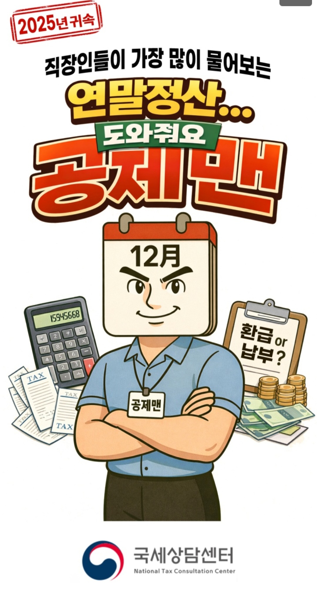국세청은 2025년 귀속 연말정산을 맞아, 인공지능(AI) 기술을 활용해 연말정산 상담 사례를 친숙한 캐릭터로 풀어낸 '연말정산 도와줘요 공제맨' 콘텐츠(4컷만화・쇼츠영상)를 제공한다.