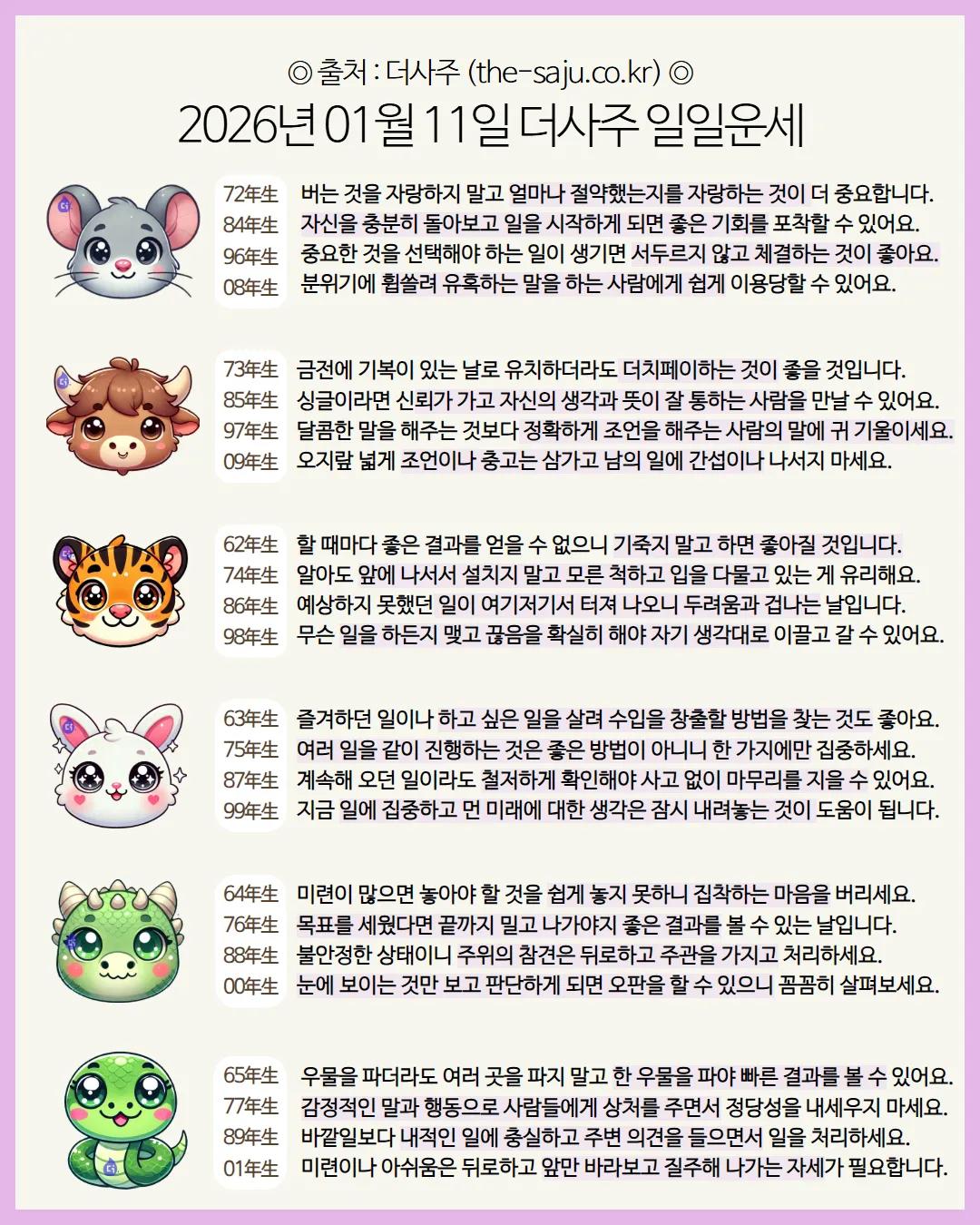 #2026년 병오년(丙午年)1월11일. 더사주.별자리.일일운세.띠별운세