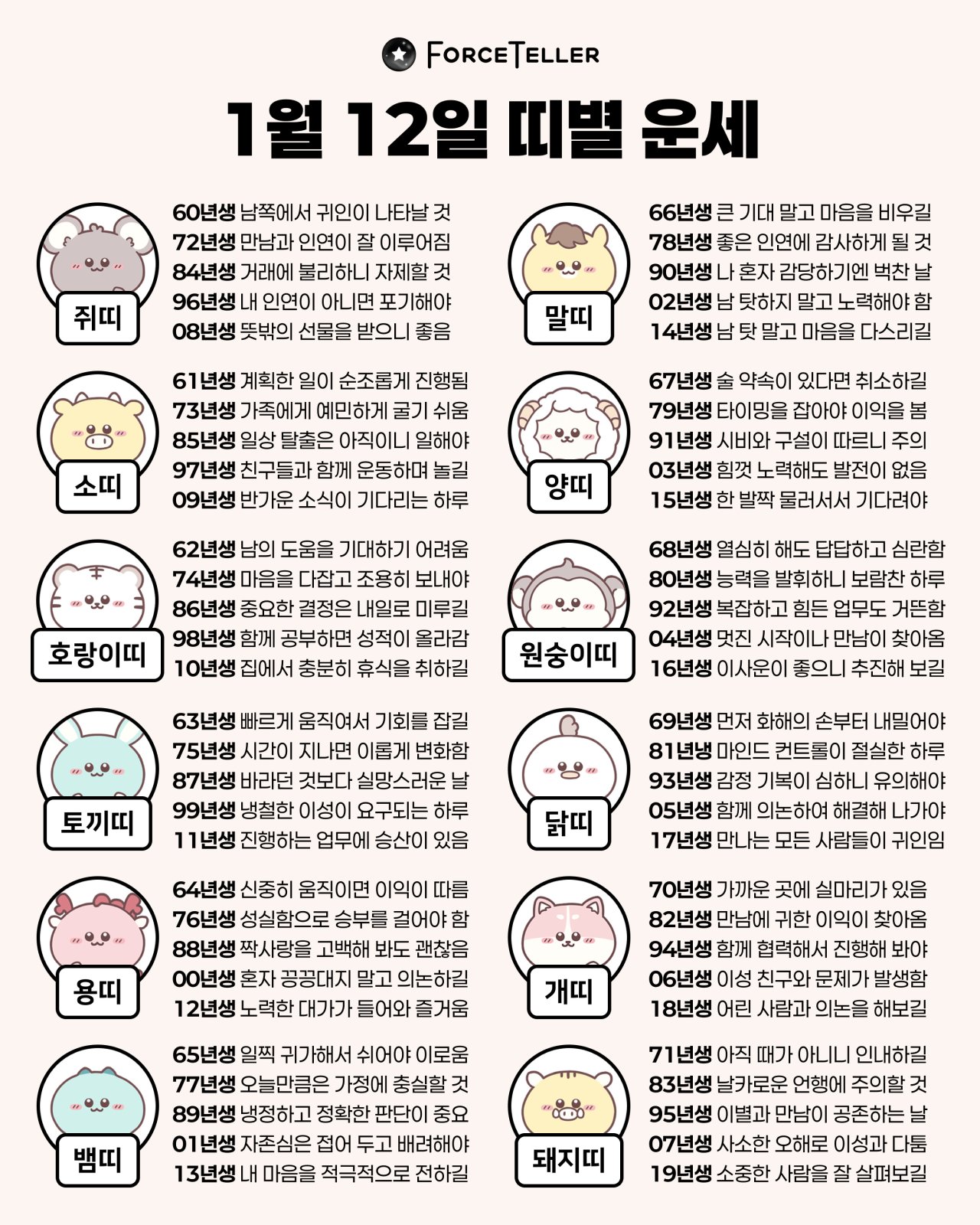 #2026년 병오년(丙午年)1월12일. 더사주.별자리.일일운세.띠별운세