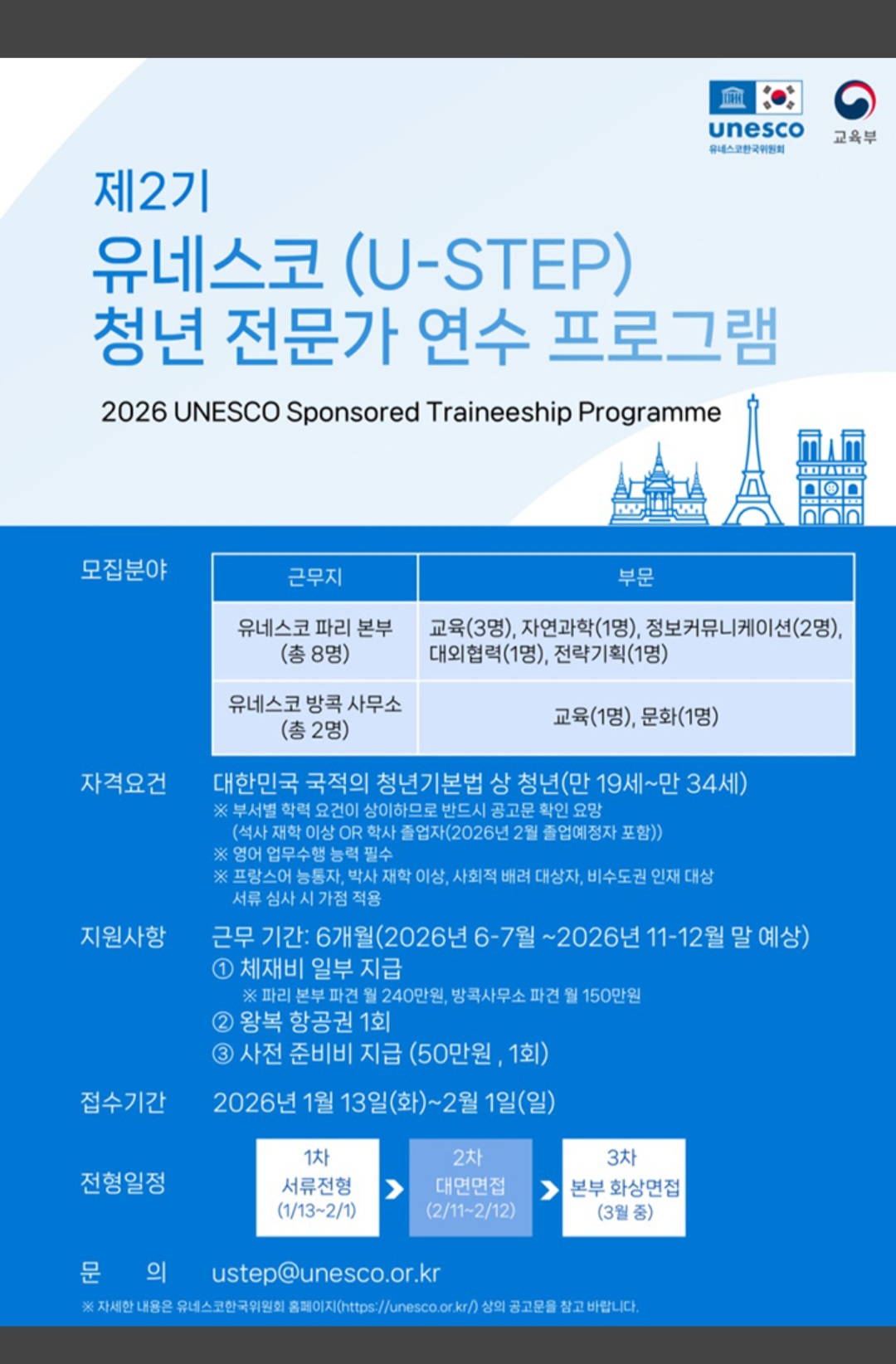 교육부와 유네스코한국위원회는 유네스코에서의 실무 연수를 지원하는 '2026년 유네스코 청년 전문가 연수 프로그램(U-STEP)' 참가자를 오는 2월 1일까지 모집한다고 13일 밝혔다.