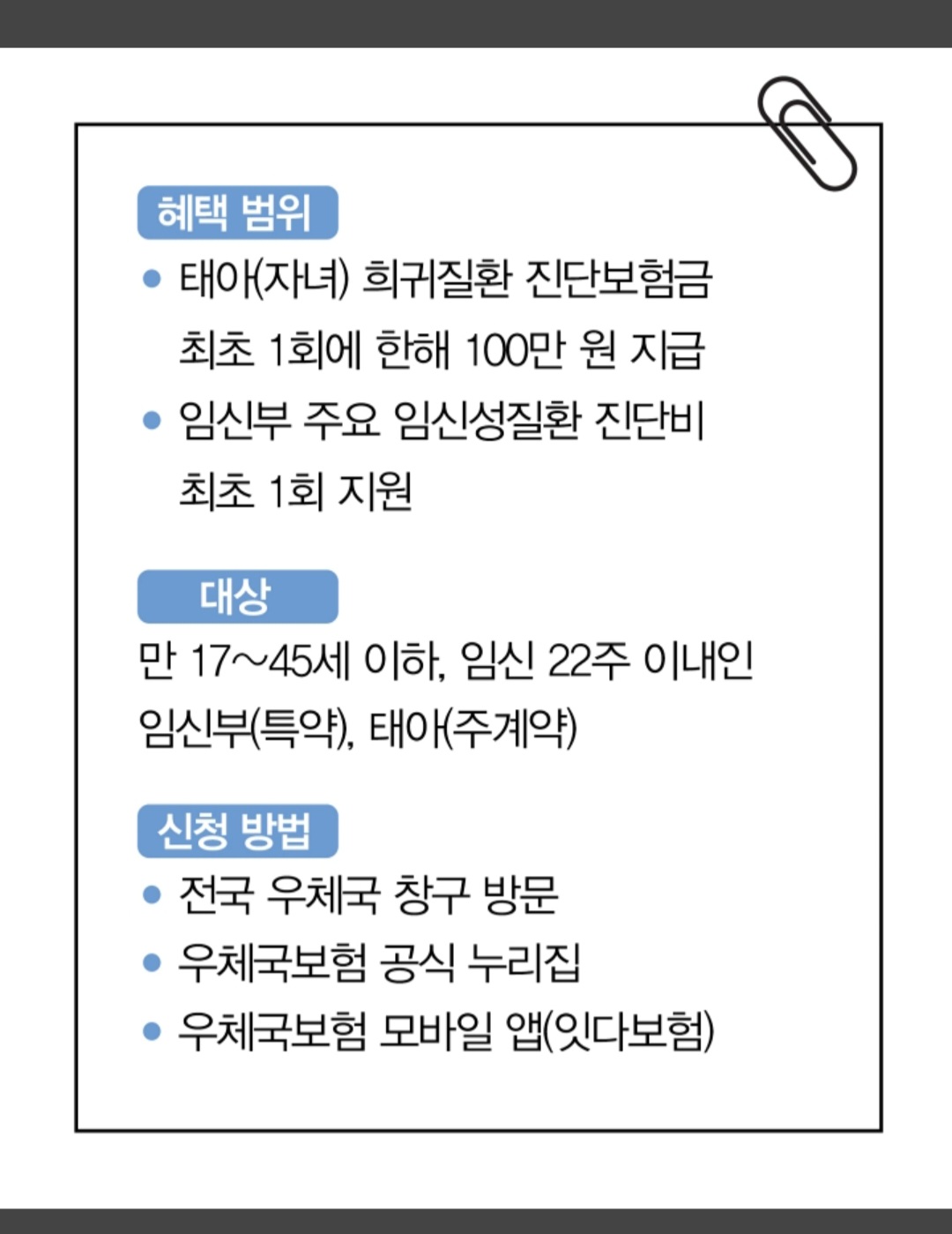 임신 22주 이내의 임신부(만 17~45세)라면 누구나 신청할 수 있고 태아도 보험 대상에 포함되기 때문에 한 번 가입하면 아이가 태어나기 전부터 보호를 받을 수 있어요. 단 쌍둥이처럼 다태아의 경우에는 다태아 중 1명만 가입이 가능해요.