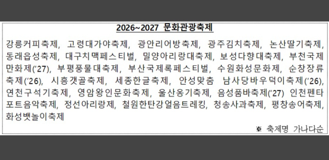 '글로벌축제'와 '예비글로벌축제'는 오는 2월까지 '2026~2027 문화관광축제' 27개와 명예축제 20개를 대상으로 공모를 진행해 선정한다. 자세한 공모 일정은 추후 공개한다.