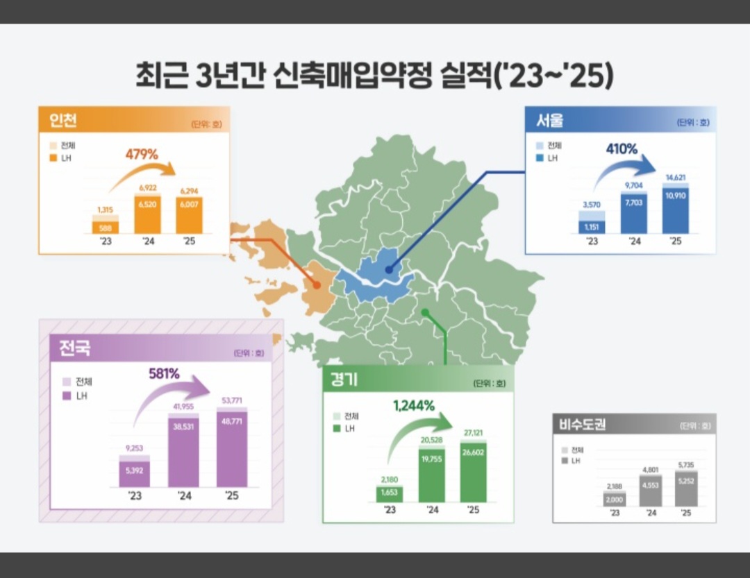 국토교통부와 한국토지주택공사(LH)는 지난해 신축 매입 약정 물량을 5만 4000호 확보했다며, 수도권과 서울을 중심으로 도심 주택 공급이 한층 속도를 내게 됐다고 28일 밝혔다.