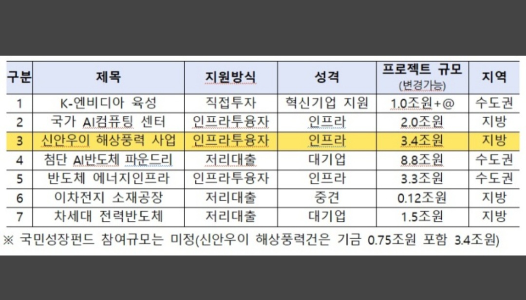 신안우이 해상풍력 발전사업의 3조 4000억 원 전체 사업비 중 첨단전략산업기금이 7500억 원을 장기 대출하는 방식으로 참여한다.
