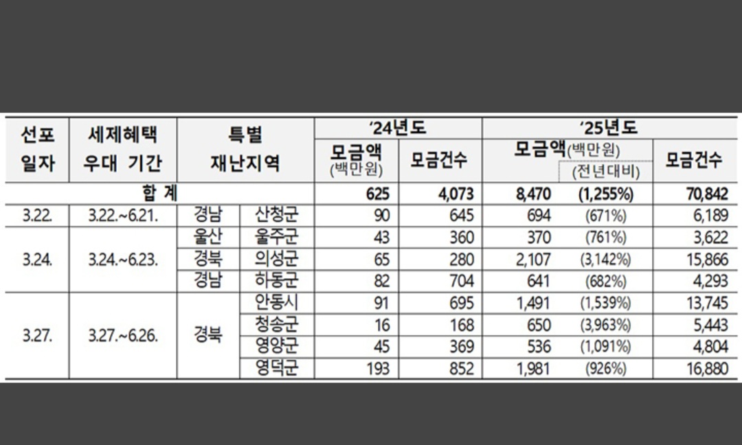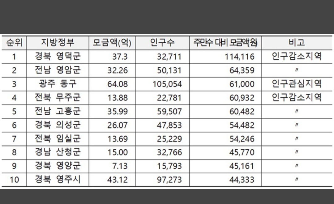 특히 영덕군의 경우 인구가 3만 명 대에 불과함에도 주민 수 기준 평균 모금액이 11만 원을 상회했다.
