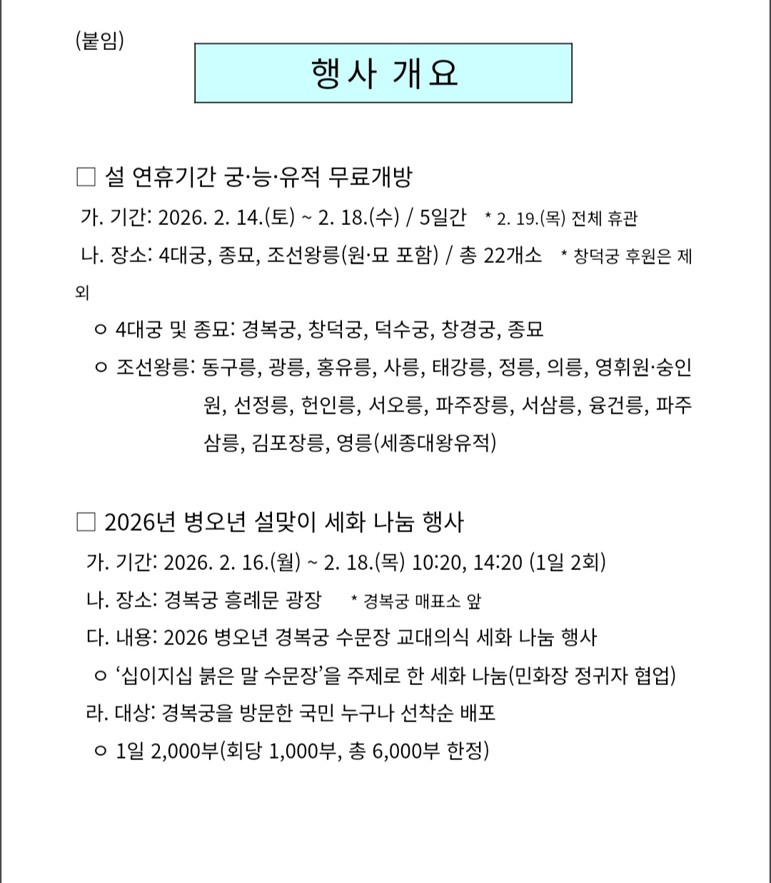 국가유산청은 우리 민족 최대의 명절인 설을 맞아 연휴기간 궁궐과 왕릉을 무료로 개방하고, 경복궁에서는 관람객들에게 세화 나눔 행사를 운영한다고 2일 밝혔다.