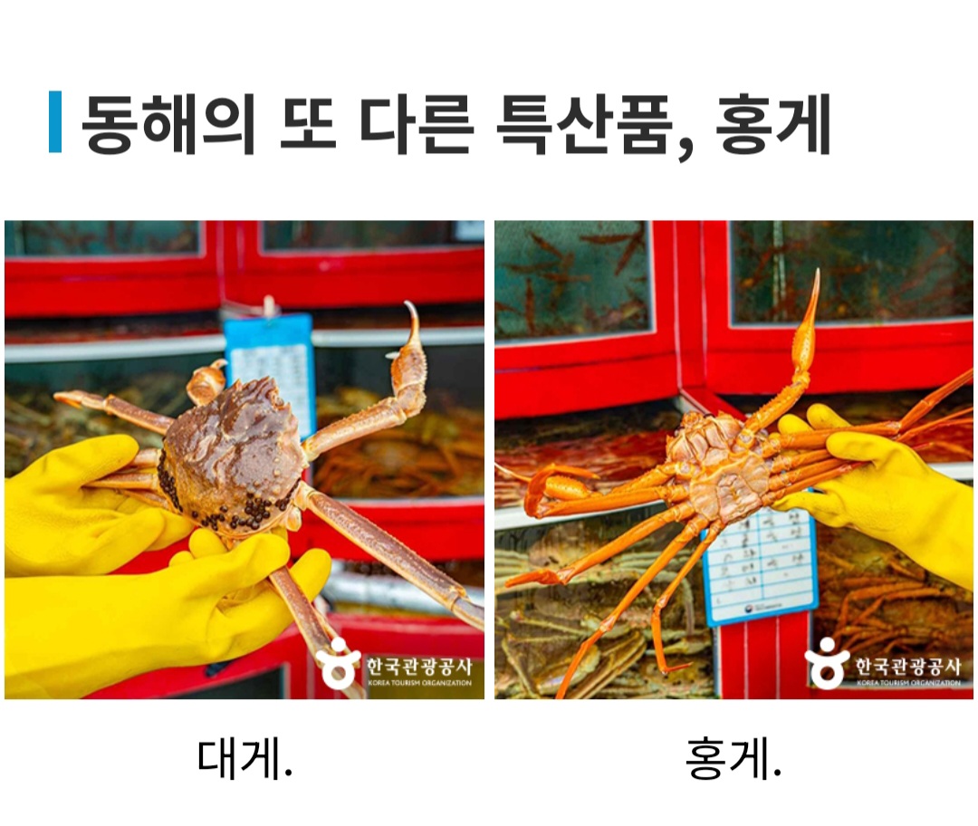 동해에서는 대게 못지않게 홍게도 잘 잡힌다. 홍게는 대게보다 선명한 빨간색을 띠며, 훨씬 더 깊은 곳에서 서식한다. 그 때문에 주로 400 미터 이상의 깊은 수심까지 수색해서 잡는다. 그리고 대게보다 많이 잡히기 때문에 가격이 대게의 절반 정도로 저렴하다. 대게와 홍게는 맛 또한 전혀 다르다. 일반적으로 대게에 비해 홍게가 더 짠 편인데, 이는 주요 서식지의 수압이 달라 생기는 차이에서 기인한다.