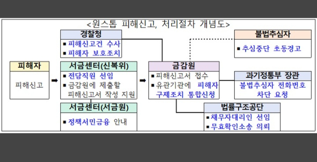 경찰청(피해신고 수사, 피해자 보호조치), 서민금융진흥원(정책서민금융 지원), 대한법률구조공단(채무자대리인 선임, 피해구제 소송 대리)은 원스톱 지원체계에 따라 의뢰된 피해자 구제조치를 처리한다.